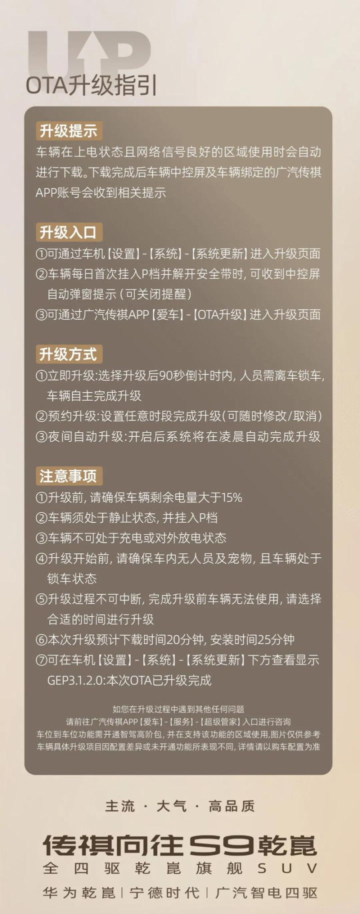 易车讯近日,我们从广汽传祺官方获悉,传祺向往S9乾崑迎来OTA升级,智驾全面进化;泊车轻松且智能;新增多种贴心提示;交互界面也迎来升级优化。