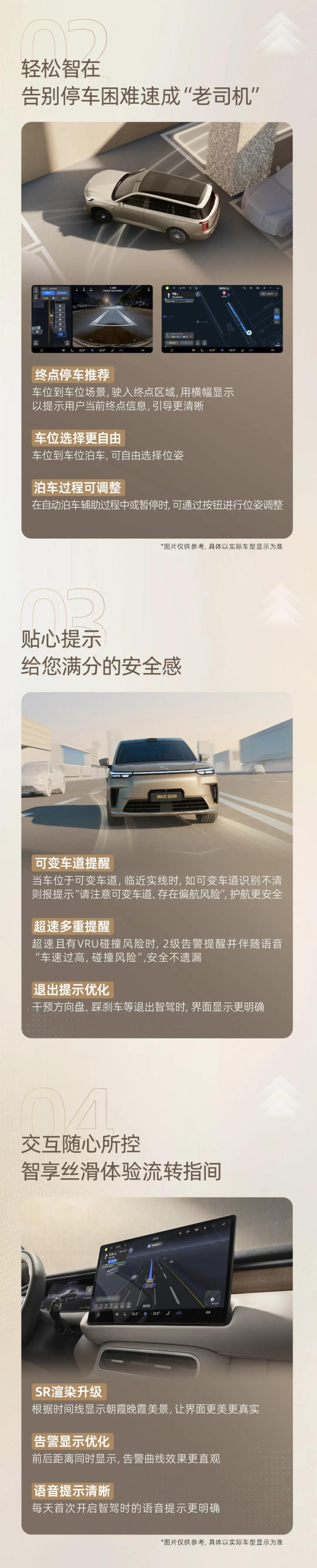 具体升级包括智能驾驶方面:高速夜间智能调速、恶劣天气智能控速、无红绿灯路口提醒、变道体验优化、新手保护机制。泊车方面:终点停车推荐、车位选择更自由、泊车过程可调整。贴心提示方面:可变车道提醒、超速多重提醒、退出提示优化。交互方面:SR渲染升级、告警显示优化和语音提示清晰。